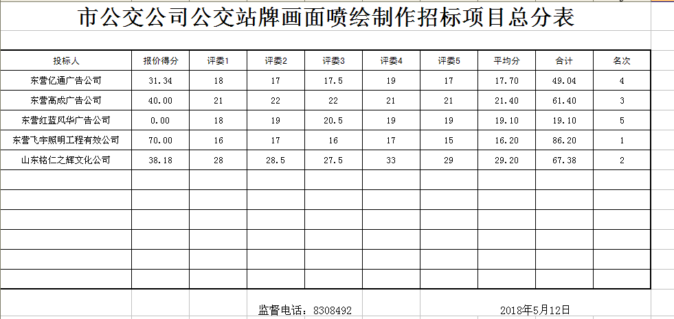 市公交公司公交站牌画面喷绘制作招标项目总分表