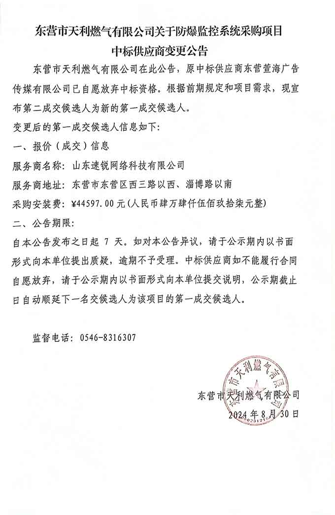 东营市天利燃气有限公司关于防爆监控系统采购项目中标供应商变更公告