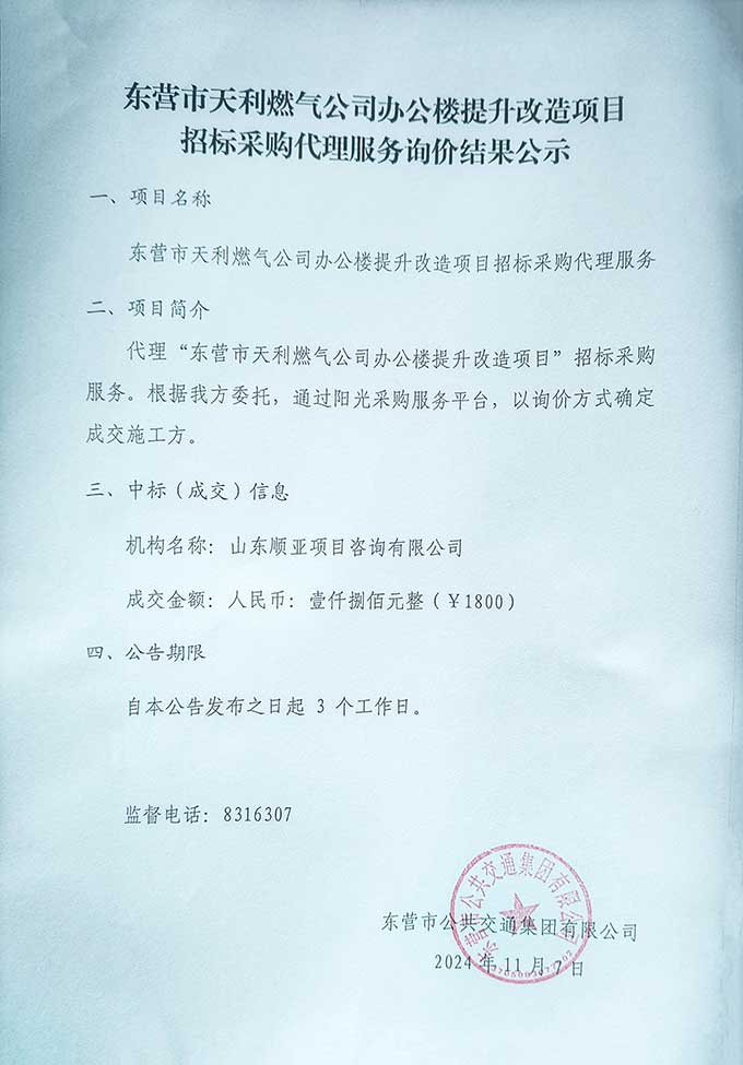 东营市天利燃气公司办公楼提升改造项目招标采购代理服务询价结果公示