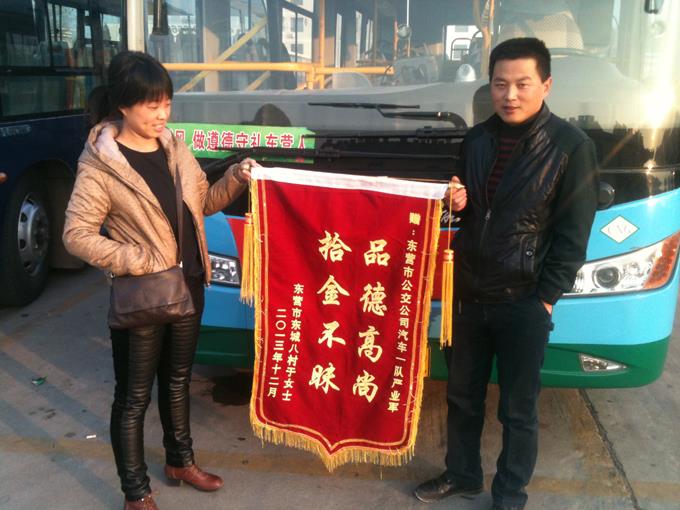 2013年12月5日,东城八村乘客于小梅女士拿着一面写有“拾金不昧、品德高尚”的锦旗来到市公交公司汽车一队,感谢车队严业军师傅拾金不昧的高尚品德。