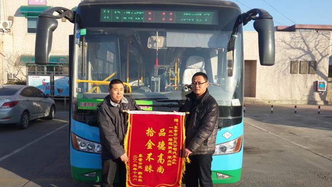 12月26日,家住东城的韩永胜先生拿着一面写有“拾金不昧,品德高尚”的锦旗来到市公交公司汽车三队,感谢车队驾驶员宋立国师傅拾金不昧的高尚品德。