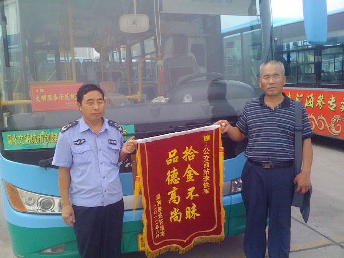 8月29日上午,垦利的许福海先生拿着一面写有“拾金不昧 品德高尚”的锦旗来到汽车三队,向9路驾驶员李铁军同志拾金不昧的高尚行为表示感谢。