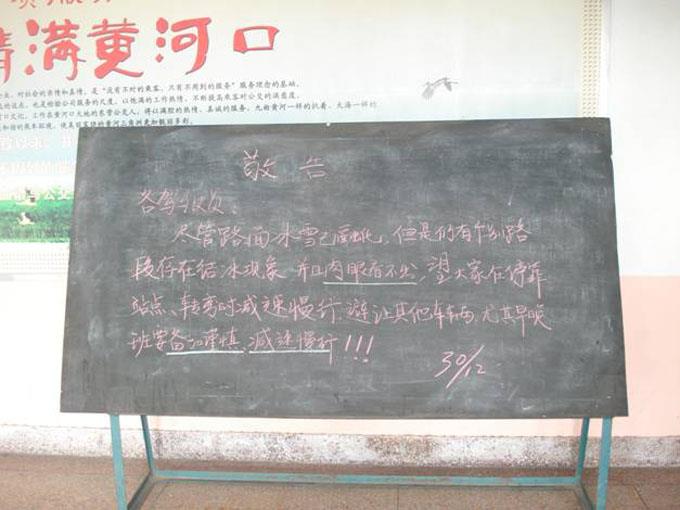 过去几天的一场大雪,给车队的安全生产带来了很大的考验,随着路面上大部分积雪的融化,车辆已经能够基本正常运行,但公交公司汽车三队管理人员对安全工作丝毫不敢松懈,坚持每天上路巡查车辆运行情况和路面违章违纪情况,根据自身实际以敬告的形式将安全提示写到黑板上,摆放在大厅门口,给驾驶员一个提醒,同时重点做好乡镇线路和个别驾驶员的安全叮嘱工作,确保行车安全。 在新的一年里,汽车三队将会采取形式新颖、措施多样的工作办法把安全工作做到实处、细处,确保车队安全形势的持续稳定。
