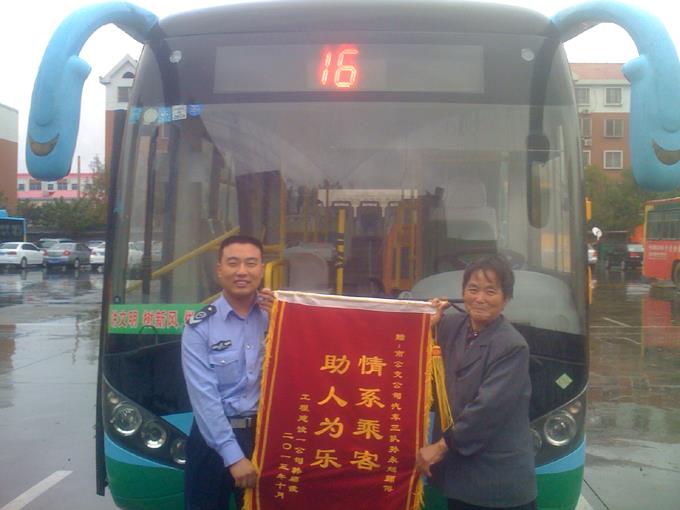 10月14日下午,一位老太太拿着一面写有“情系乘客,助人为乐”的锦旗,来到市公交公司汽车三队办公室,对16路驾驶员孙永超表示致谢,也为公交公司和车队培养了如此优秀的员工表示敬意……