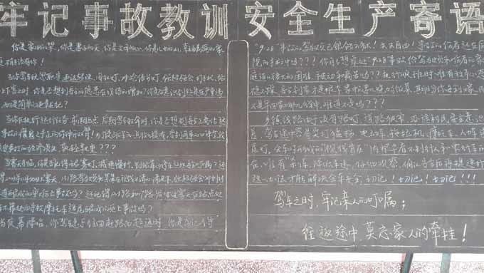 近日,市公交公司汽车三队为贯彻落实好公司第四季度安委会的会议精神,做好驾驶员工安全教育,进一步抓好车队安全生产工作,一是针对乡镇线路的营运特点,专门出了一期“安全生产黑板报”,二是专门制作了一幅以“注重安全,关爱生命”为主题的展板,摆放到大厅里,以此警醒和告诫广大一线驾驶员,行车中要把安全放在首位,牢记遵纪守法,按章行车、谨慎驾驶、确保安全。