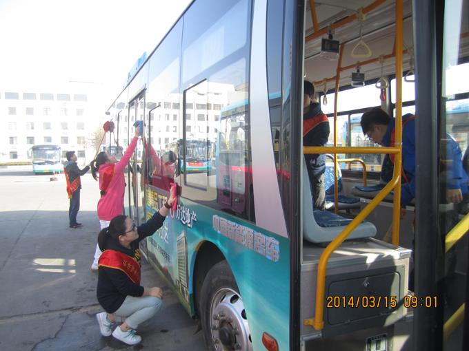3月15日上午,市公交公司汽车一队联合东营市职业学院开展了学雷锋活动。来自该校经济贸易与管理学院的大学生和车队职工共计28人,分两个小组,一组乘坐公交车上路为特需乘客服务,帮助疏导乘客;一组帮助驾驶员擦拭车身,清扫车厢卫生。大家工作起来井然有序,有条不紊,尤其活跃在车厢为乘客服务的志愿者们,更是得到了乘客的一致好评,成为公交车上一道亮丽的风景。