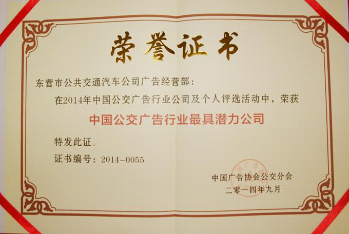 近日,在中国广告协会公交分会举行的《中国公交广告行业最具影响力公司》和《中国公交广告行业最具潜力公司》评选活动中,东营市公交公司广告部喜获“中国公交广告行业最具潜力公司”称号,这表明在公司领导的大力支持和全体职工的共同努力下,经广告行业协会的规范引领,广告部的各方面工作已经取得了稳步的发展,具备了一定竞争实力,这一称号,将进一步激发全体广告职工的工作热情,以整体强劲的势头,投身到激烈的行业竞争当中,再创更好的经济效益和社会效益。