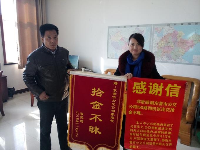 2014年11月12日,家住东营区锦绣龙轩小区的张微来到市公交公司汽车四队,送来一面写有“拾金不昧”的锦旗和感谢信,感谢车队驾驶员张连花拾金不昧的高尚品德。