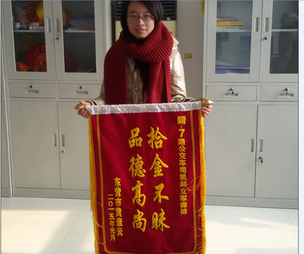 1月13日,家住东营区牛庄镇魏家村的黄素云乘坐公交公司汽车四队的7路车外出,不慎把背包遗忘在公交车上,匆忙赶到车队,得知失物已被驾驶员郝立军捡到,并交到车队办公室妥善保管,终于放下心来。黄素云的背包内有钱包(钱包内有美金、日元、韩币、港币、台币等各类现金数千元和身份证等重要物品)、苹果笔记本电脑、苹果平板电脑、单反照相机、衣服等贵重物品,接过失而复得的背包,黄素云非常感动,并执意要给郝立军酬金表示感谢,被郝立军婉言谢绝了。