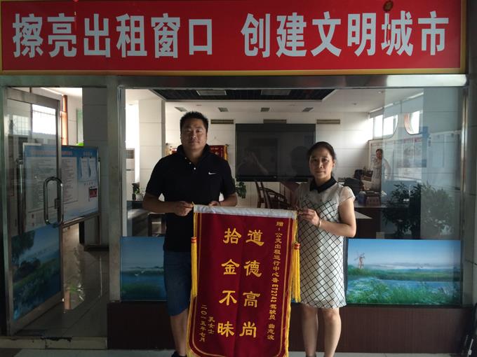 7月24日乘客孔女士乘坐鲁ET2742出租车从燕山路到东城银座,下车时不慎将10辆胜利油田货运机动车登记证书及其他手续遗落在出租车上,因下车时孔女士未要出租车乘车票据,无法联系该出租车驾驶员。 出租车驾驶员曲志波发现遗失物品后立即送到市公交公司出租运营中心,在运营中心的帮助下联系上了孔女士,将遗失在出租车上的物品如数归还,乘客为了表示对出租车驾驶员的感谢,于7月27日委托其丈夫送来锦旗一面。