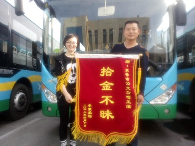 4月9日,在中心医院上班的李蒙蒙女士来到市公交公司汽车四队,送来一面写有“拾金不昧”的锦旗,表扬驾驶员王滨。