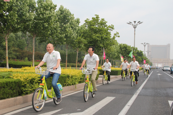 上午九时,来自市公交公司和环保局的70余名志愿者汇集在黄河影剧院停车场,统一骑行公共自行车,身着统一环保T恤,由黄河影剧院出发,行经府前大街—胜利大街—潍河路—东三路等东城区主要繁华路段,开展了浩浩荡荡的绿色骑行宣传活动。