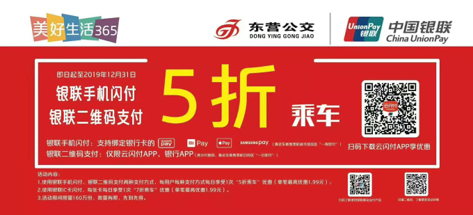 为倡导绿色低碳出行环境,让市民充分享受到公交优先发展的成果,自即日起至12月31日,市公交公司联合银联再次推出便民服务举措。市民使用银联手机闪付、云闪付APP二维码或各银行APP二维码支付两种支付方式,每用户每种支付方式每天享受1次“5折乘车”优惠(单笔最高优惠1.99元);使用银联IC卡闪付每卡每天享受1次“7折乘车”优惠。活动期间优惠总额160万元,先到先得,满额为止。