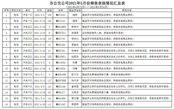 近段时间以来,东营公交广大驾驶员在做好疫情防控的同时,积极投身公交服务质量提升工作。经过持续不断的努力,公交服务质量明显提高,涌现了一大批的好人好事,受到乘客的好评,大力营造了“比、学、赶、帮、超”的良好氛围。 广大驾驶员要以受到表扬的同志为榜样,爱岗敬业、无私奉献,为树立和维护公司的外在形象作出贡献。同时也希望受到表扬的同志戒骄戒躁,再接再厉,发挥模范作用,继续为公司的服务提升工作贡献力量。