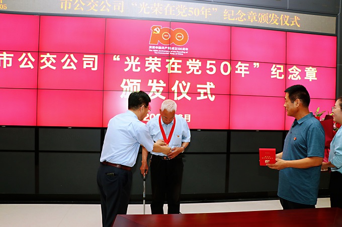 6月24日上午,在中国共产党成立100周年即将到来之际,东营公交组织开展了“光荣在党50年”纪念章颁发仪式。公司党委书记赵龙、经理刘海、副经理孙红光、景洪培和党龄50周年老党员以及党员代表等参加了颁发活动。