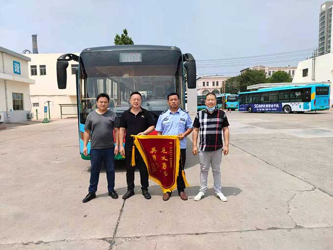 7月11日上午,市民王云峰和家人带着绣有“见义勇为、英勇救人”的锦旗来到市公交公司汽车一队,感谢103路驾驶员商光亮的救人之举。