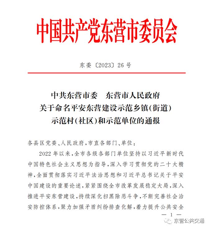 近日,市委市政府联合印发《关于命名平安东营建设示范乡镇(街道)示范村(社区)和示范单位的通报》(东委〔2023〕26号),市公交公司再获表彰,被市委市政府命名为市级平安交运企业