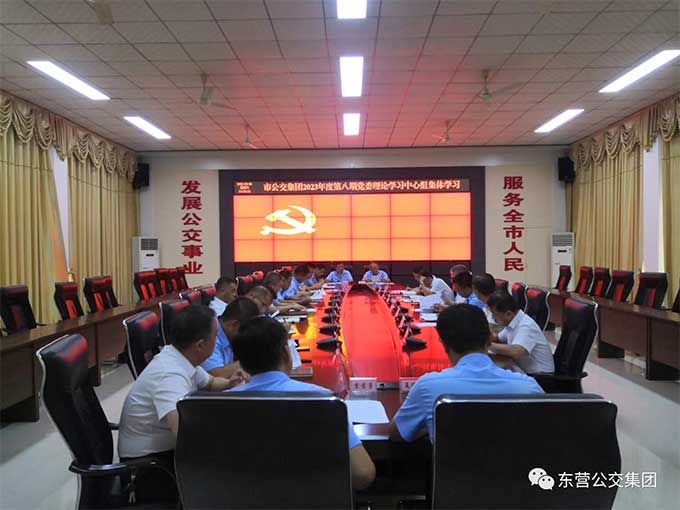 2023年8月26日下午14时30分,市公交集团在办公楼一楼会议室组织2023年度第八期党委理论学习中心组集体学习,赵龙同志主持会议并讲话,集团公司党委成员、各支部书记以及学习秘书参加集体学习。