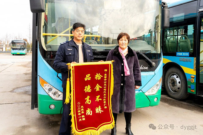 2024年1月19日,失主史女士及家人将一面绣着“拾金不昧 品德高尚”的锦旗送至市公交集团汽车七队李广滨师傅手中,感谢李广滨师傅归还遗失手提包的感人事迹。