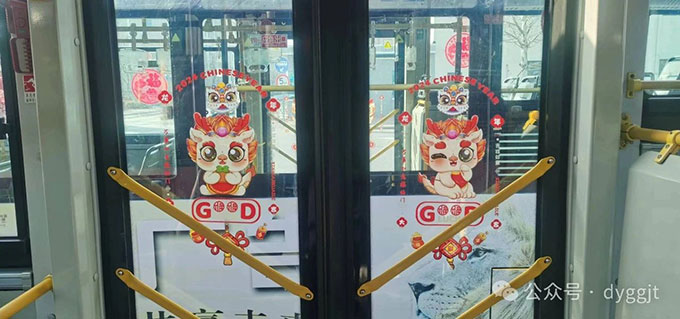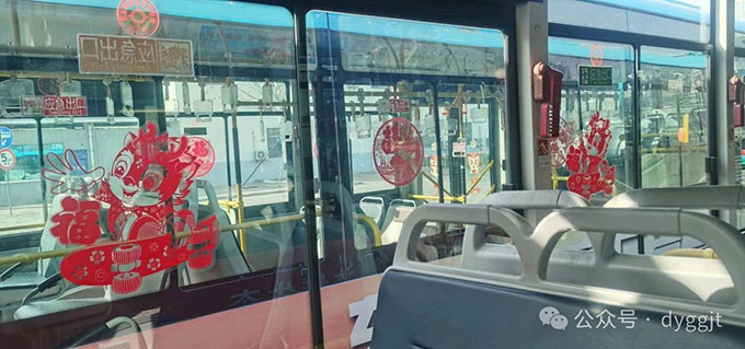 近日,为营造更加浓厚的龙年新春氛围,给市民更好的乘车体验,东营市公交集团在部分公交车车厢挂上了一连串的龙年拉花,还贴上了喜庆的窗花、“龙”形状的贴画……打造“温馨车厢”,让乘客一进车厢,就感受到浓厚的春节氛围。