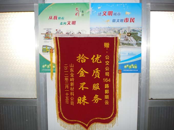 这位小伙子名叫燕同意,是山东金岭新材料公司的一名职工,2012年2月15日上午,刚下了早班的燕同意乘坐8:40的164路返回东城,下车时将钱包落在了公交车上。跑回东城的驾驶员郭丽云在打扫车辆卫生时看到了一个棕色的牛皮钱包,里面3000多元现金,4张银行卡,1张银联卡,1张身份证。面对鼓鼓的钱包,郭丽云第一时间将钱包交到了车队。并与车队工作人员一起通过包内的卡片多方联系,在短短不到半个小时内便将钱包送到了失主的手中。小燕问驾驶员名字,郭丽云却怎么也不肯告诉他。小燕通过多方打听才知道了她的姓名。时隔多日,小燕带着感激的心情送来了一面写有“优质服务、拾金不昧”的锦旗。