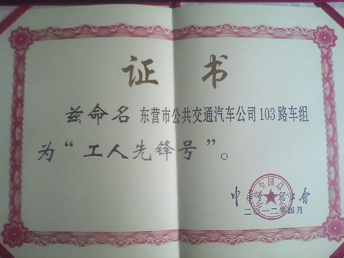 近年来,市公交公司103路车组人员把优质服务作为积极奉献的目标,视乘客为亲人,爱岗敬业,无私奉献,出色地完成了各项营运生产任务,得到了广大乘客的一致好评,被亲切地称之为“满意车”、“放心车”、“安全车”。并先后获得山东省城建行业“文明服务标兵”、东营市五一劳动奖章、东营市“十佳服务标兵”、“市级工人先锋号”、市文明委授予的“全市十佳文明示范窗口”、省总工会授予的“山东省工人先锋号”等多项荣誉称号,展示了公交驾驶员良好的精神风貌,营造了和谐文明的社会氛围。