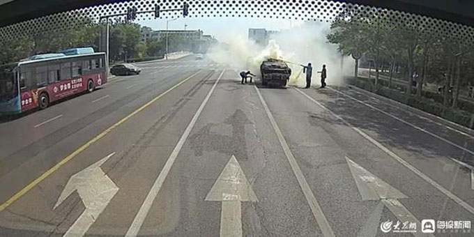9月10日13点03分,东营公交通勤车队驾驶员王维明像往常一样执行124路公交车运营任务,当他驾车行驶到沂州路与浏阳河路交叉口红绿灯时,发现了异常情况——前方一辆货车起火了,王师傅没有丝毫畏惧,立即停车开门,提起车载灭火器冲下了车。